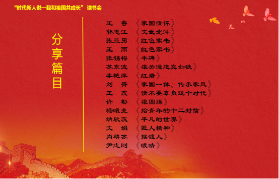 伴隨著悠揚旋律,中智云南分公司全體干部員工同聲唱響歌曲《我和我的祖國》,拉開了讀書會序幕。全體干部員工一一登臺,對《家國情懷》、《文武北洋》、《紅色家書》、《豐碑》、《雄關(guān)漫道真如鐵》、《紅巖》、《家國一體,傳承家風》、《請不要辜負這個時代》、《狼圖騰》、《給青年的十二封信》、《平凡的世界》、《匠人精神》、《擺渡人》、《眼睛》等十五個讀書篇目進行分享,講述感悟心得,朗誦部分章節(jié),表白愛國之情。